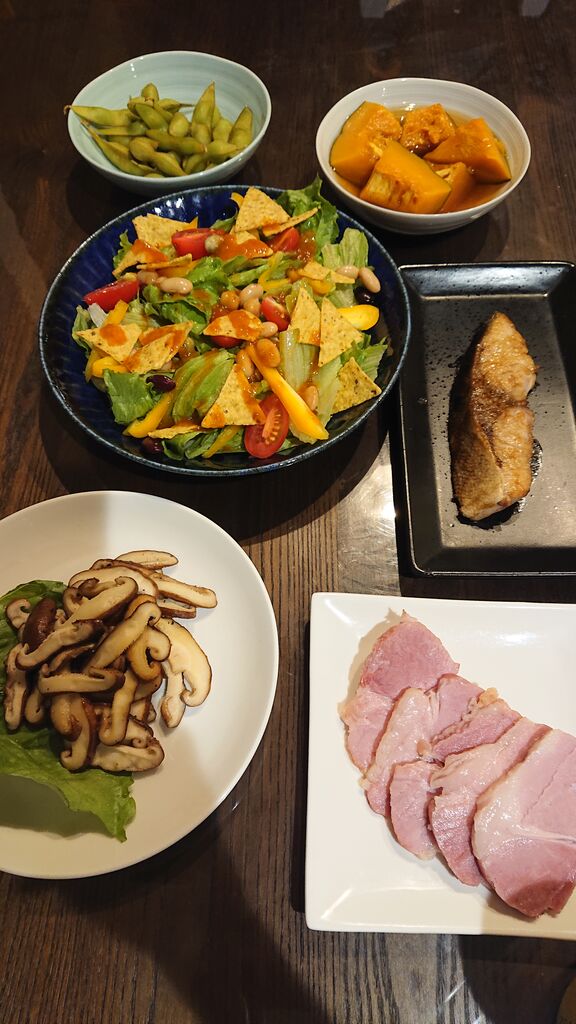 枝豆、カボチャ煮、タコスサラダ、