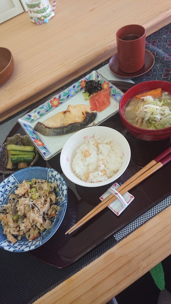 具沢山の大盛豚汁に豆ごはん。