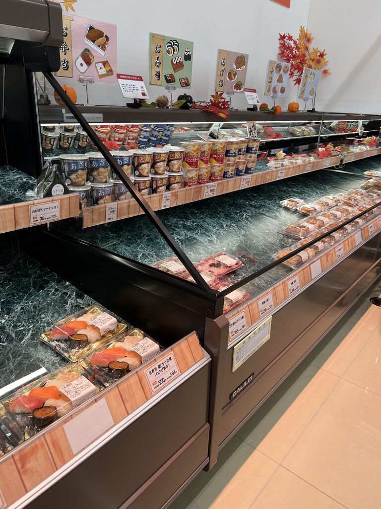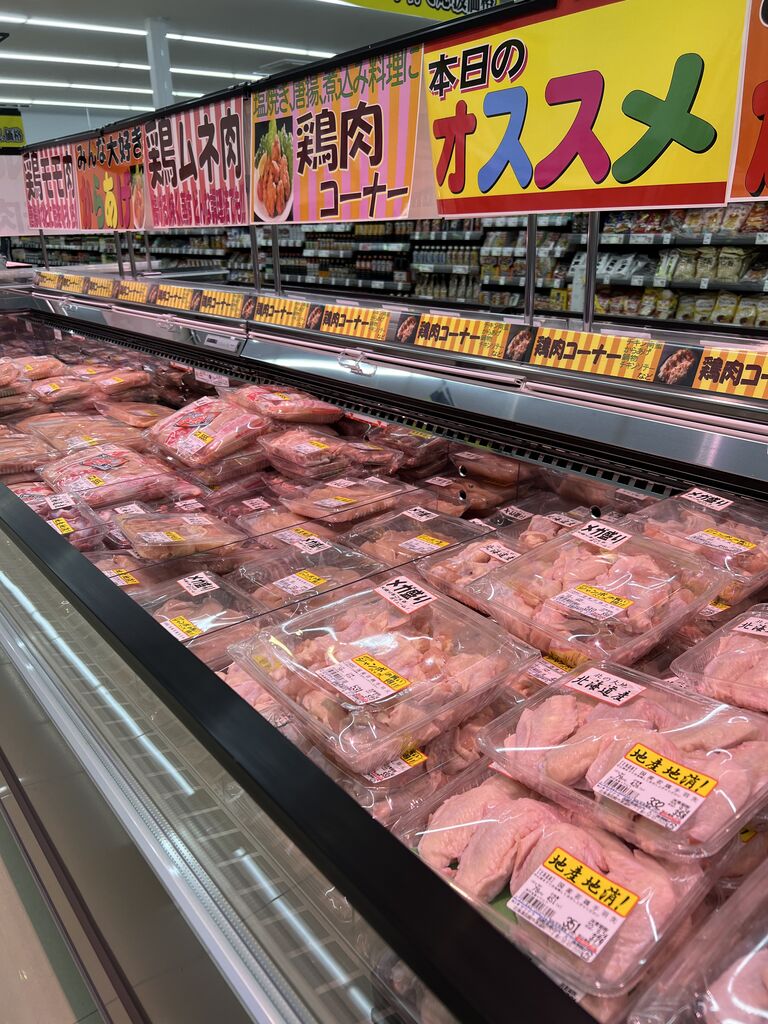 お惣菜コーナーと大量のお肉販売コーナーが