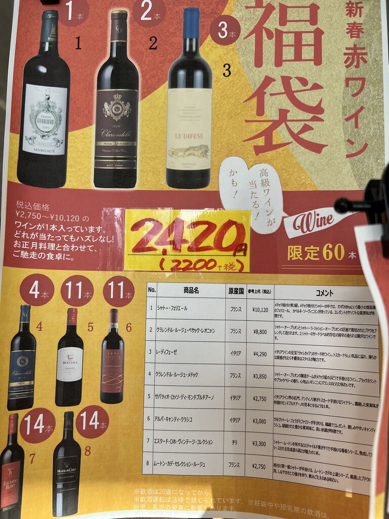 今年は2420円で60本のワインの中から