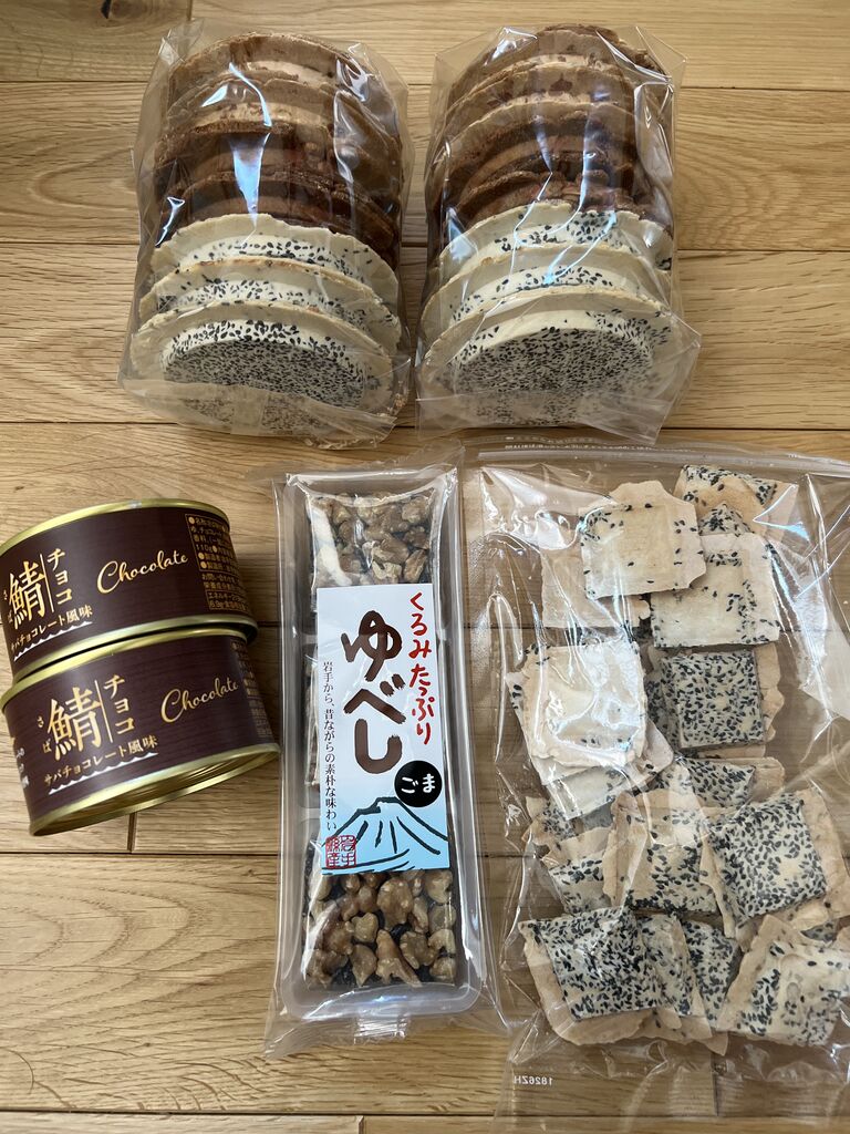 お煎餅と胡麻ゆべし、1口バター煎餅と鯖チョコ。
