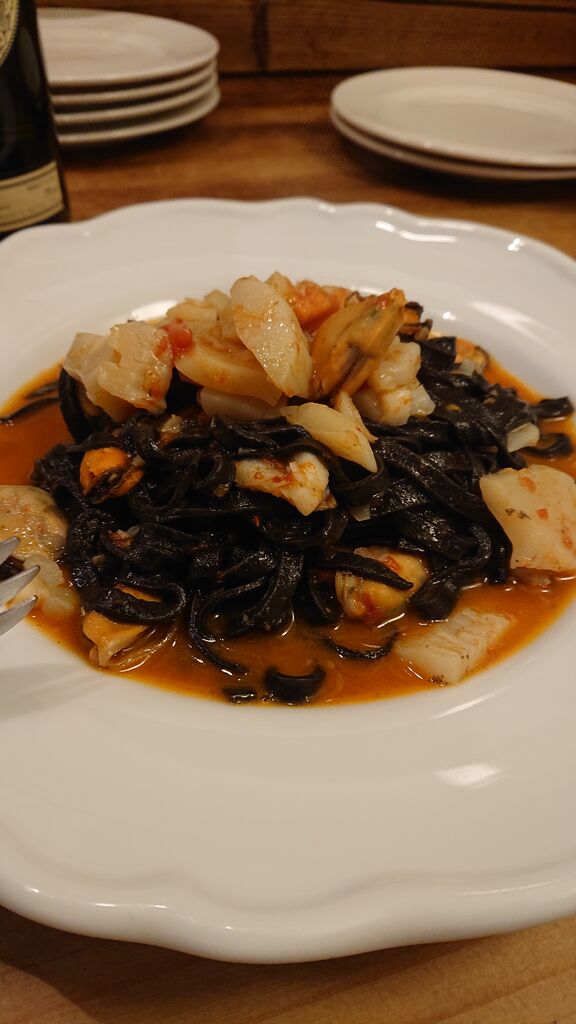 こちらは魚介のイカ墨いりタリオリーニ1200円