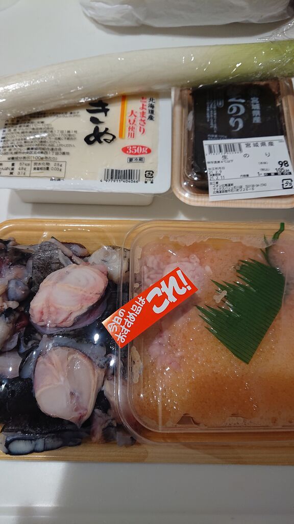 ごっこ、生のり、絹ごし豆腐、長ネギ。
